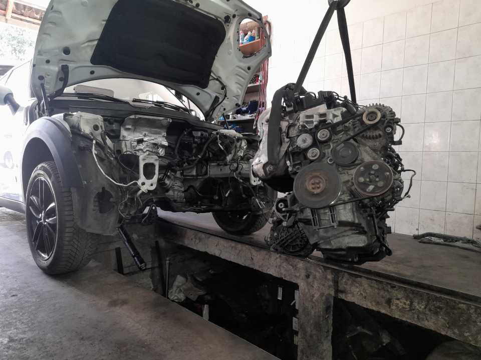 Kupljen na auto placu…..dovezen na prikolici do kupca…..kupac registrovao…. presao 300m i umro menjac…..ok nista strasno…uzimamo da popravimo menjac i onda nastaje pakao odnosno ustanovljavamo da je mini odatle i stigao….pocinjemo rasklapanje radi vadjenja motora i menjaca i sve radimo bez alata….jedino farovi bili zasrafljeni sve ostalo samo uhvaceno rukom….ulje na sve strane…karter probili srafom pa zalili diht masom….manzetne sve procurele….menjac samo jedan sraf stegnut….creva goriva struzu po poluosovini….iber menjaca slomljen…hladnjak ulja menjaca deformisan…sonde poispadale iz dpf…bregaste starog tipa usrafljene sa opel srafovima….sanacija puknutog lanca i polomljenih klizaca nakaradno popravljena….i povrh svega menjac upropasten usled nestrucne montaze odnosno nepravilnog uzubljenja konvertera u uljnu pumpu……sredjivanje u toku i dug put minija kroz cistiliste u vaskrsenje…